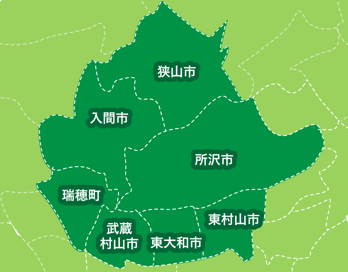 一部対応エリア:三芳町、新座市、清瀬市、東久留米市、瑞穂町、小平市、国分寺市、立川市川越市、飯能市、国立市、国分寺市、福生市、羽村市、青梅市、昭島市、日高市、朝霞市、和光市、富士見市、ふじみ野市、志木市、東村山市、東大和市、武蔵村山市